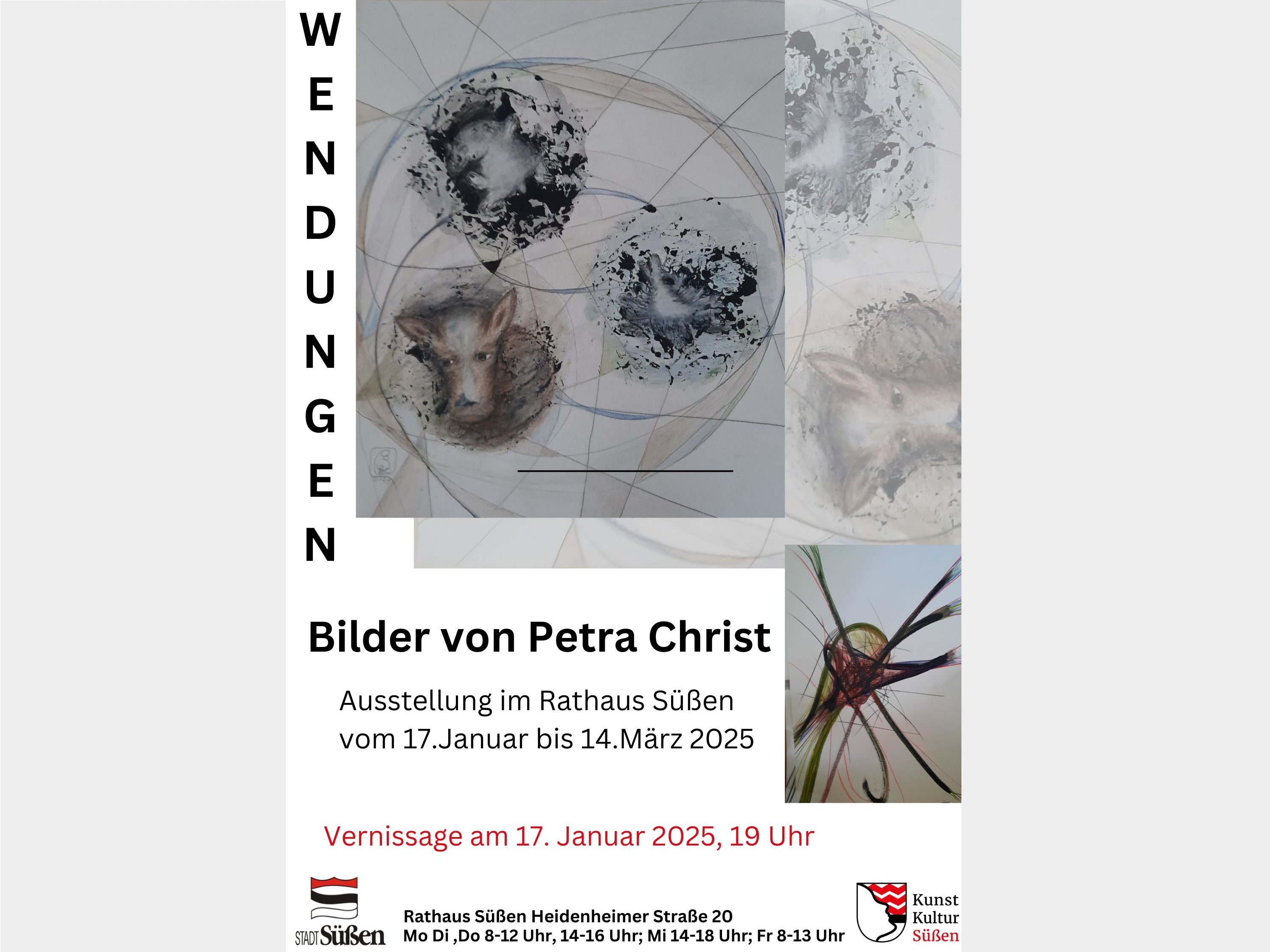 Kunstfreunde dürfen sich auf ein besonderes Ereignis freuen: Vom 17. Januar bis 14. März 2025 präsentiert die Künstlerin Petra Christ ihre Werke im Rahmen der Ausstellung „Wendungen – Bilder von Petra Christ“ im Rathaus Süßen. Die Vernissage findet am 17. Januar 2025 um 19 Uhr im Rathaus statt und lädt herzlich zum feierlichen Auftakt ein.