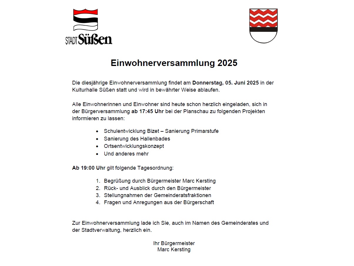 Zur Einwohnerversammlung lade ich Sie, auch im Namen des Gemeinderates und der Stadtverwaltung, herzlich ein.
