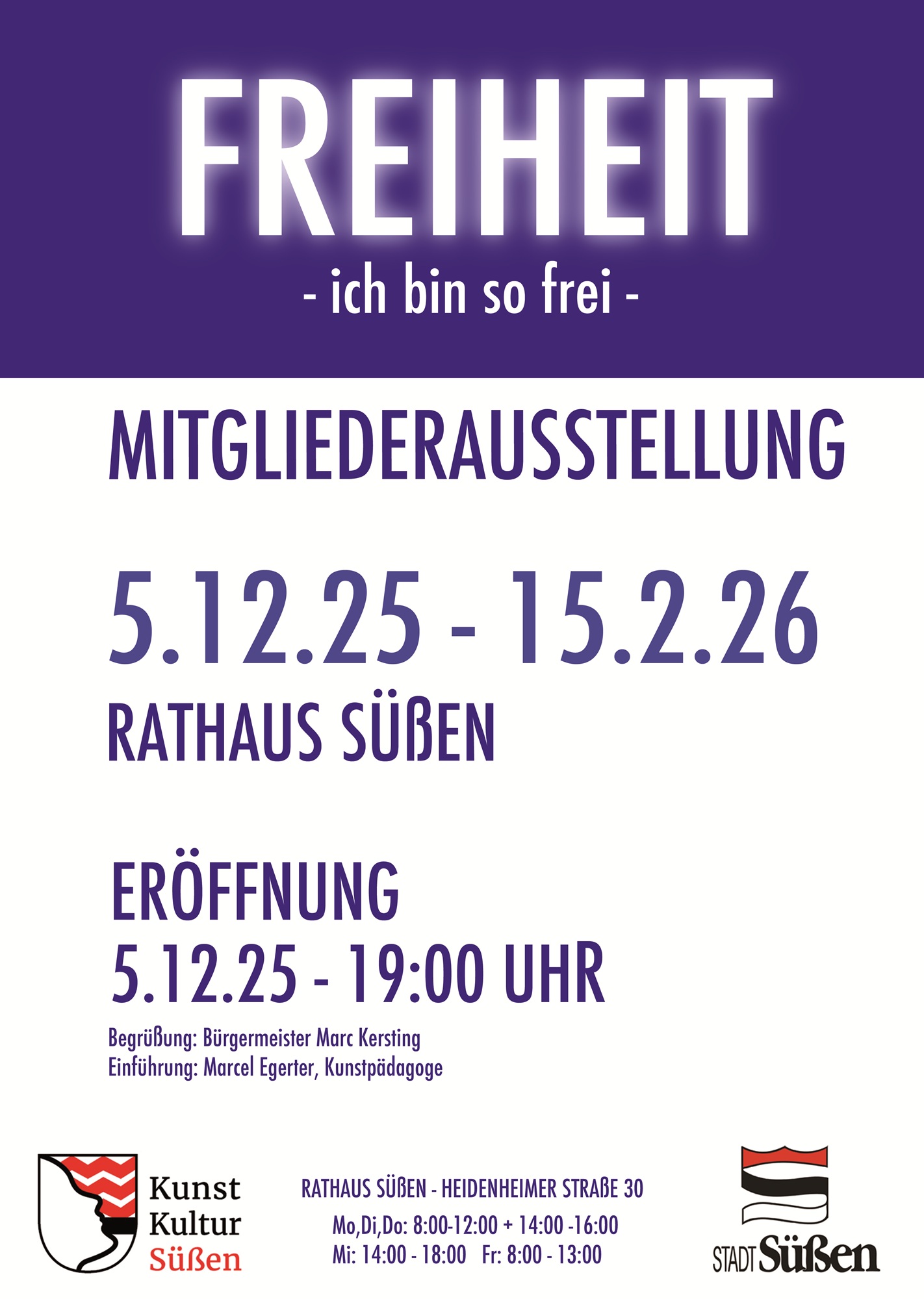 Vom 05.12.2025 bis 15.02.2026 präsentieren zwölf Künstlerinnen und Künstler des Kunstvereins Süßen im Rahmen der Mitgliederausstellung "Freiheit" ihre Werke im Rathaus Süßen.