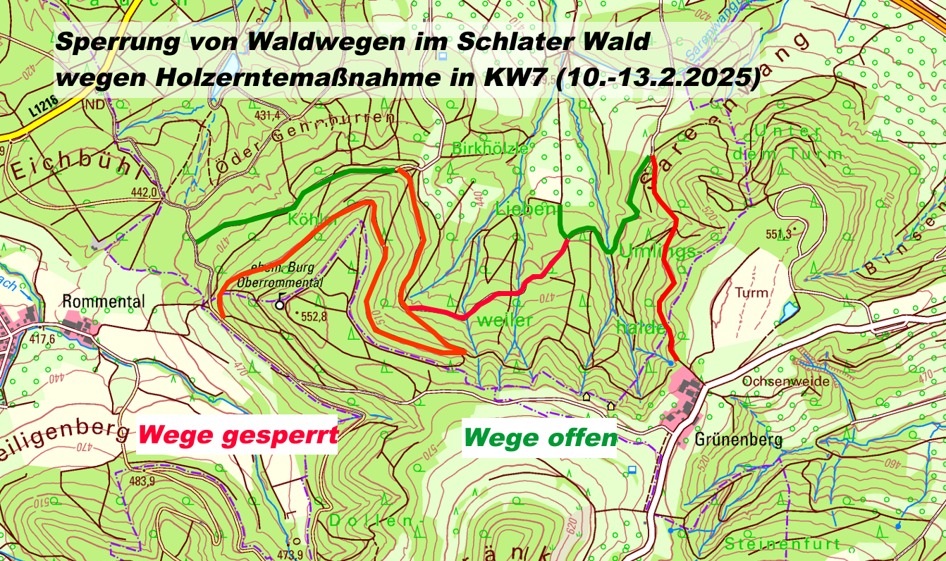 Aufgrund dieser Holzerntemaßnahmen müssen verschiedene Wege im Schlater Wald, unter anderem der Weg nach Grünenberg, bis voraussichtlich Donnerstag, 13.02.2025 gesperrt werden.