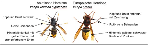 Die Asiatische Hornisse hat einen schwarzen Kopf und Brustbereich sowie gelbe Beine. Im Gegensatz dazu hat die heimische Europäische Hornisse einen rotbraunen Kopf und Brustbereich und steht unter strengem Schutz.